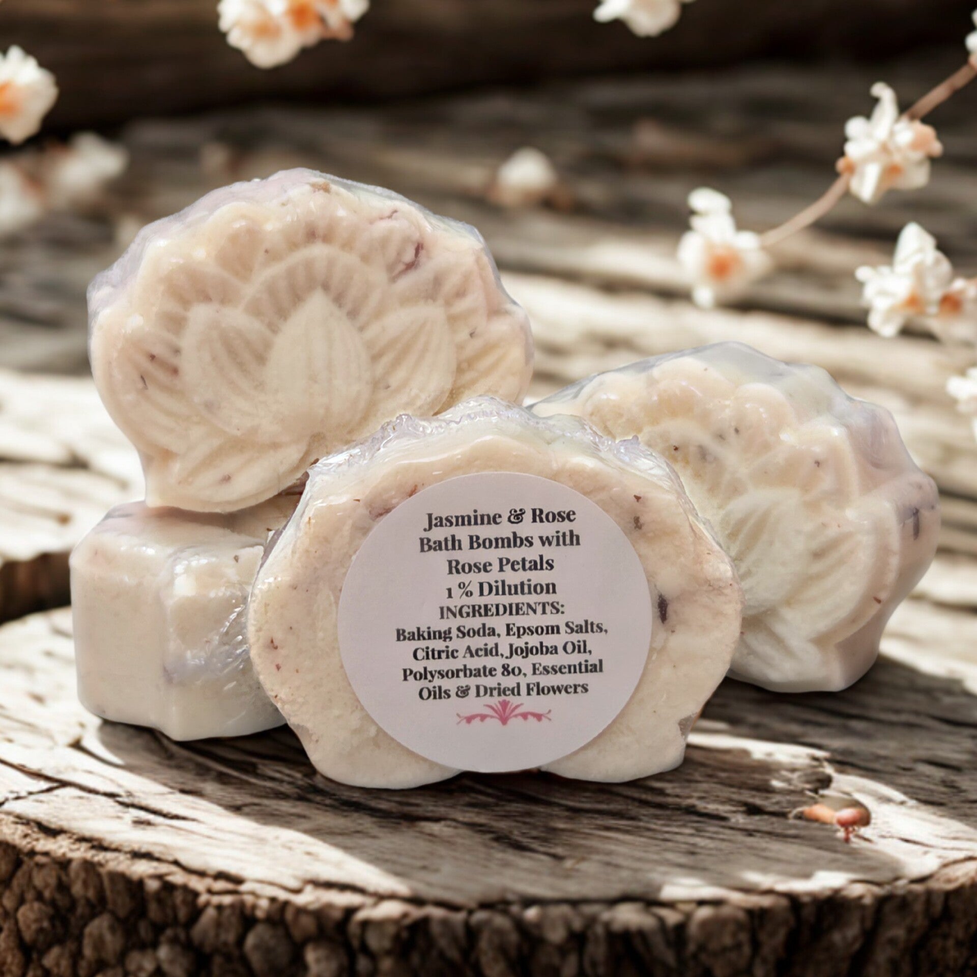 Jasmine & Rose Bath Bomb Set (4-Pack, 2oz each, 1% dilution) Immerse yourself in a luxurious floral escape with this set of four bath bombs, crafted with a delicate blend of jasmine and rose at 1% dilution. Infused with dried rose petals, each bomb dissolves to release a soft, romantic aroma, wrapping you in a serene and soothing bath experience. Perfect for self-care or a thoughtful gift.