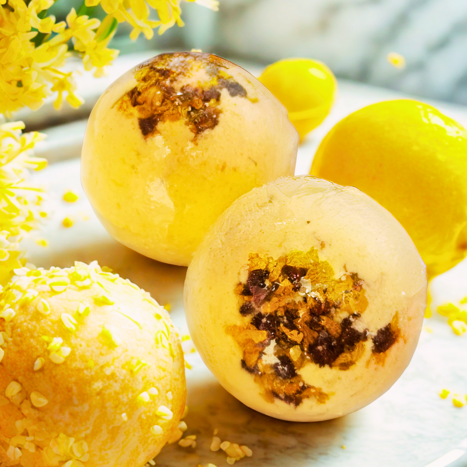Single Lemon Bath Bomb with Chrysanthemum Bath Bomb 4.5oz (with crystal heart inside)