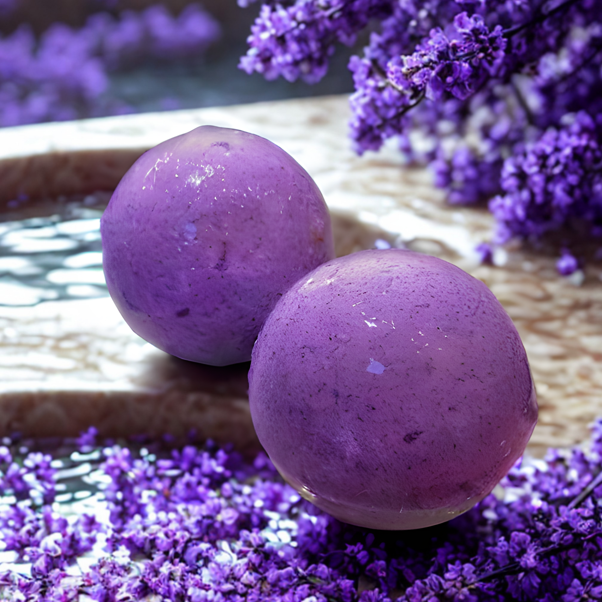 Ingredients: Baking Soda, Fine Epsom Salt, Citric Acid, Cornstarch, Polysorbate 80 and Jojoba Oil, Essential Oils, Mica Powder and Dried Lavender Buds